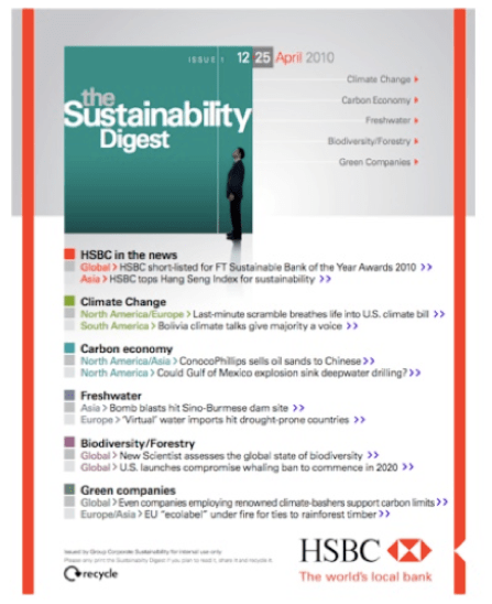 I created and edited an inhouse weekly news digest for HSBC devoted to sustainability issues. It ran from 2006 to 2010 and was distributed to over 1000 of the bank's executives and employees to help with ESG investment decision making.